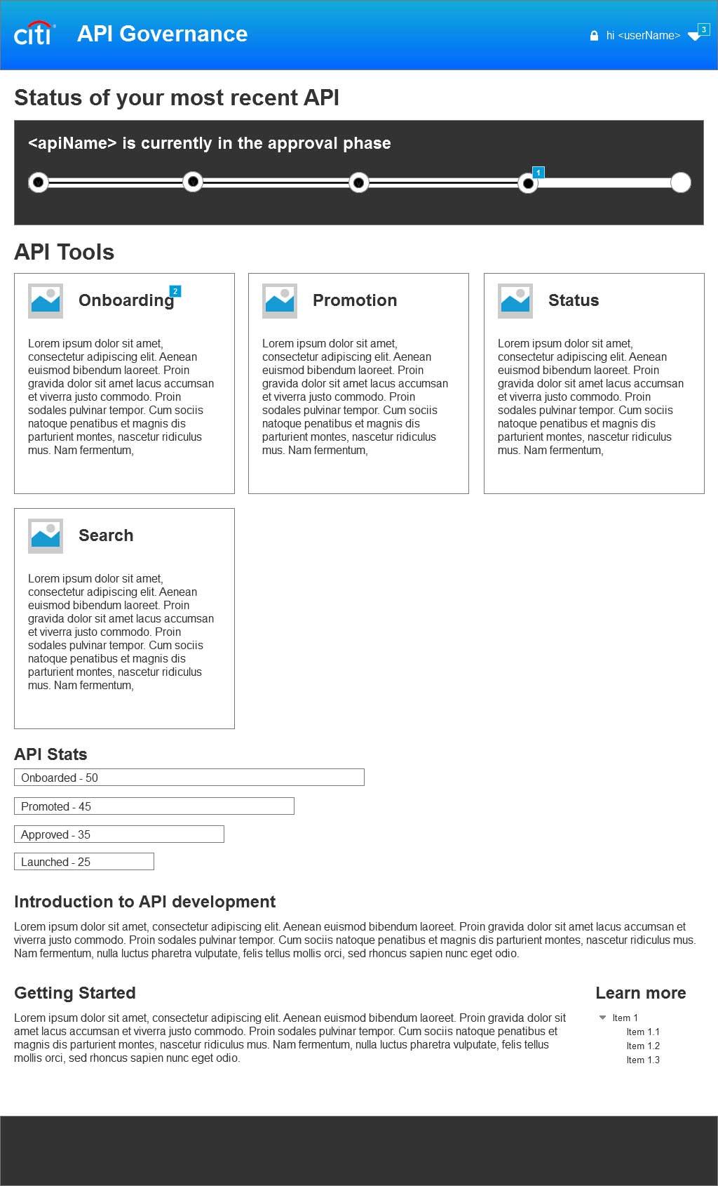 When conducting user research, I discovered that one very important issue for the developers was knowing where within the approval process their API was. When logging in their primary question would be is my API approved or not?. When developing the dashboard page wires, it then seemed very important to address this concern. By including a prominent status bar at the top, measuring where the API was in the approval process, developers would have a clear picture of where the last API they submitted was. They could also hover over key points in the process seeing what has been approved. If they had to take any direct action, an alert would be displayed as well.